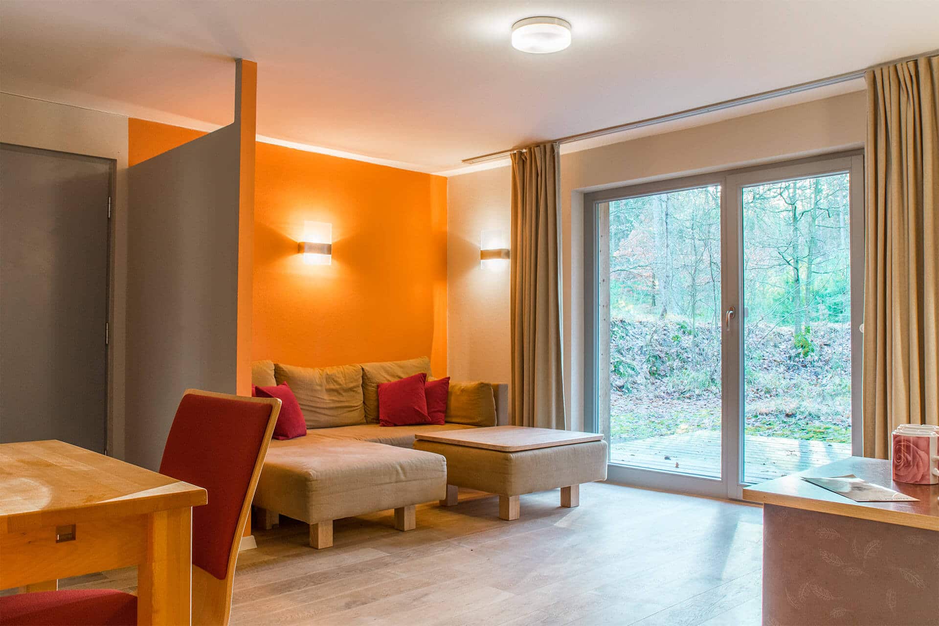 Die Öko-Waldhäuschen sind gut isolierte Flachdach-Bungalows, eine Zentralheizung sorgt für angenehme Temperaturen auch im Winter. Anders als in Ferienwohnungen gibt es keine Küche in der Grundausstattung der Häuschen, da sich unsere Gäste gerne im Restaurant am Buffet verwöhnen lassen. Von dort können Sie übrigens jederzeit Getränke aus dem rund um die Uhr geöffneten Buffet-Restaurant mitnehmen.