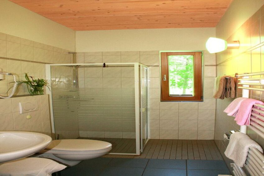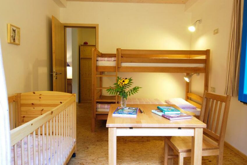 Im Waldhaus unten gibt es 2 Wohnungen mit separaten überdachten Eingängen. Die Apartments im Erdgeschoß sind vom Zuschnitt her ideal für Familien mit bis zu 3 Kindern. Das Schlafzimmer ist mit Doppelbett ausgestattet, das Nebenzimmer hat 2 Einzelbetten (je 0,9 x 2 m).