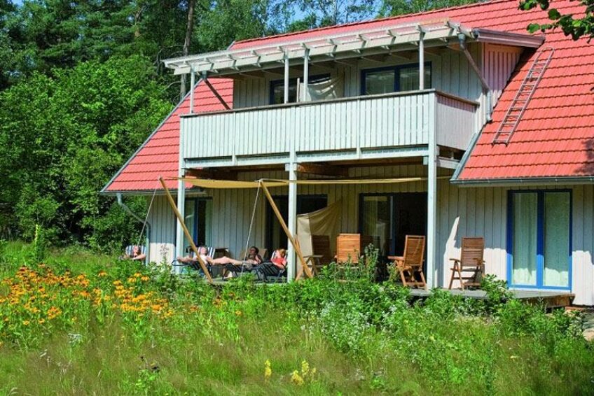 Die Terrassen am Wohnzimmer und Schlafzimmer liegen nach Südosten gerichtet mit schönem Blick auf die Waldwiese. Das Waldhaus liegt zusammen mit den kleinen Waldhäuschen in der familienfreundlichen Waldsiedlung in der Nähe des Abenteuer-Spielplatzes.
